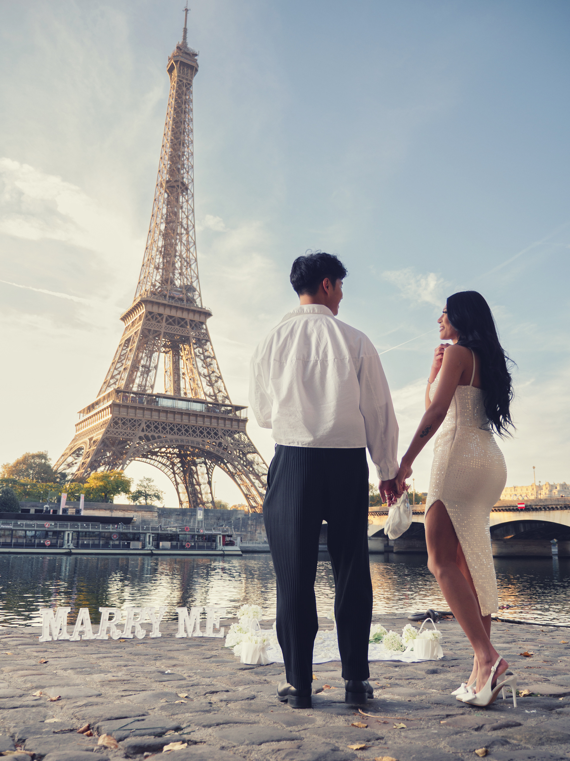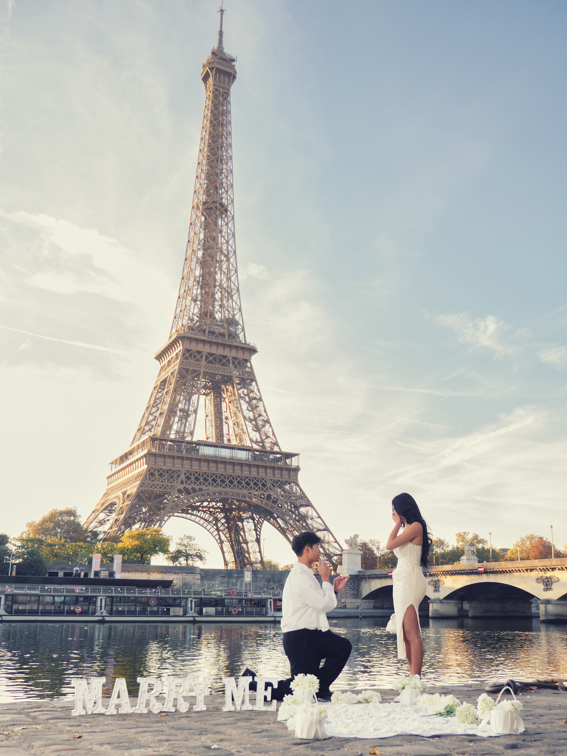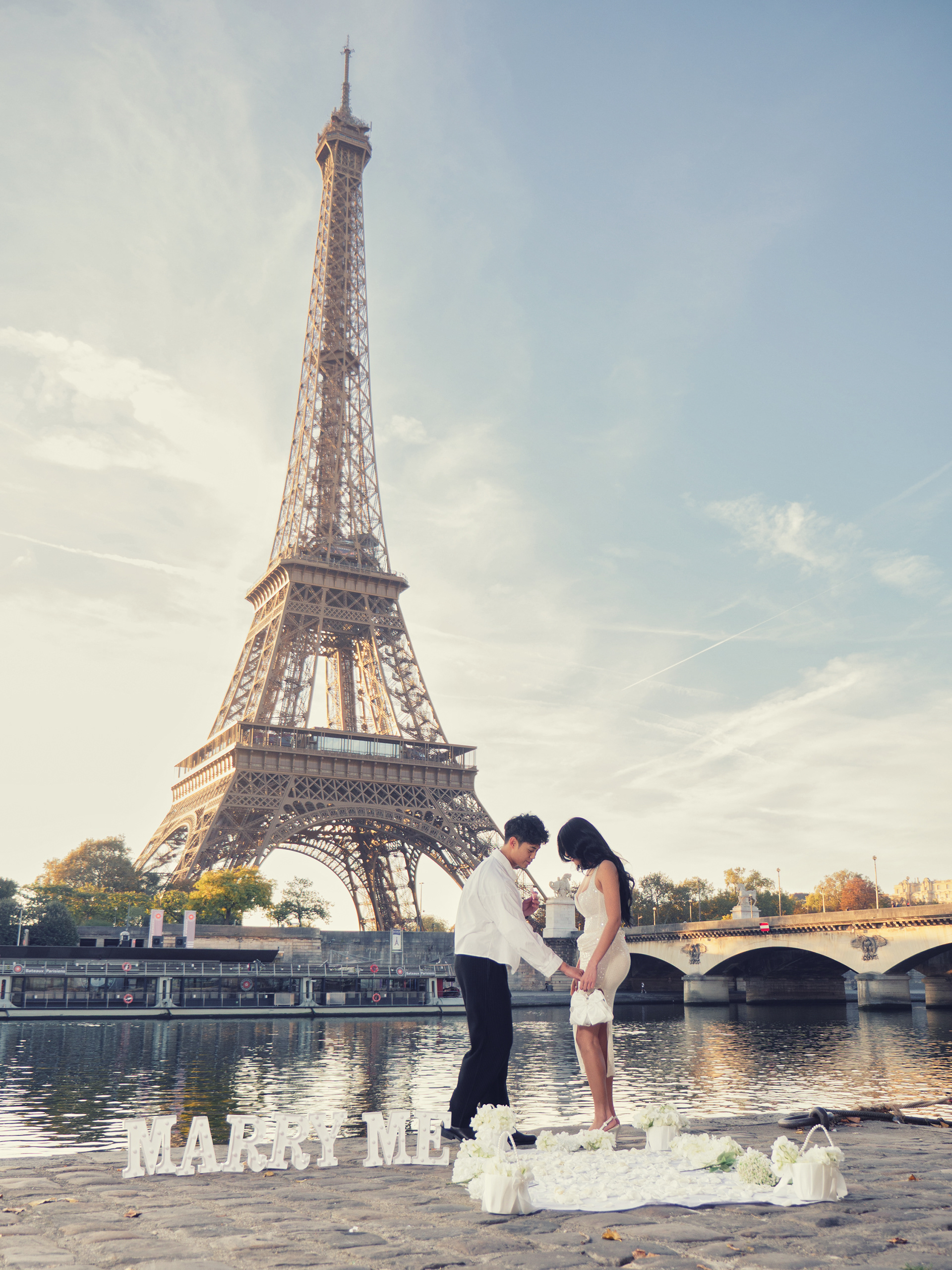 As the day breaks, our couple starts their walk at Place du Trocadero and slowly make their way down to the left bank of the river Seine. Here a white carpet lined with flowers leads the way to the spot where he will get down on one knee and pose the most important question of his life. Basking in the first light of the day, standing across from each other, she accepts as he takes her right hand and put that ring who's traveled halfway around the world on her finger.