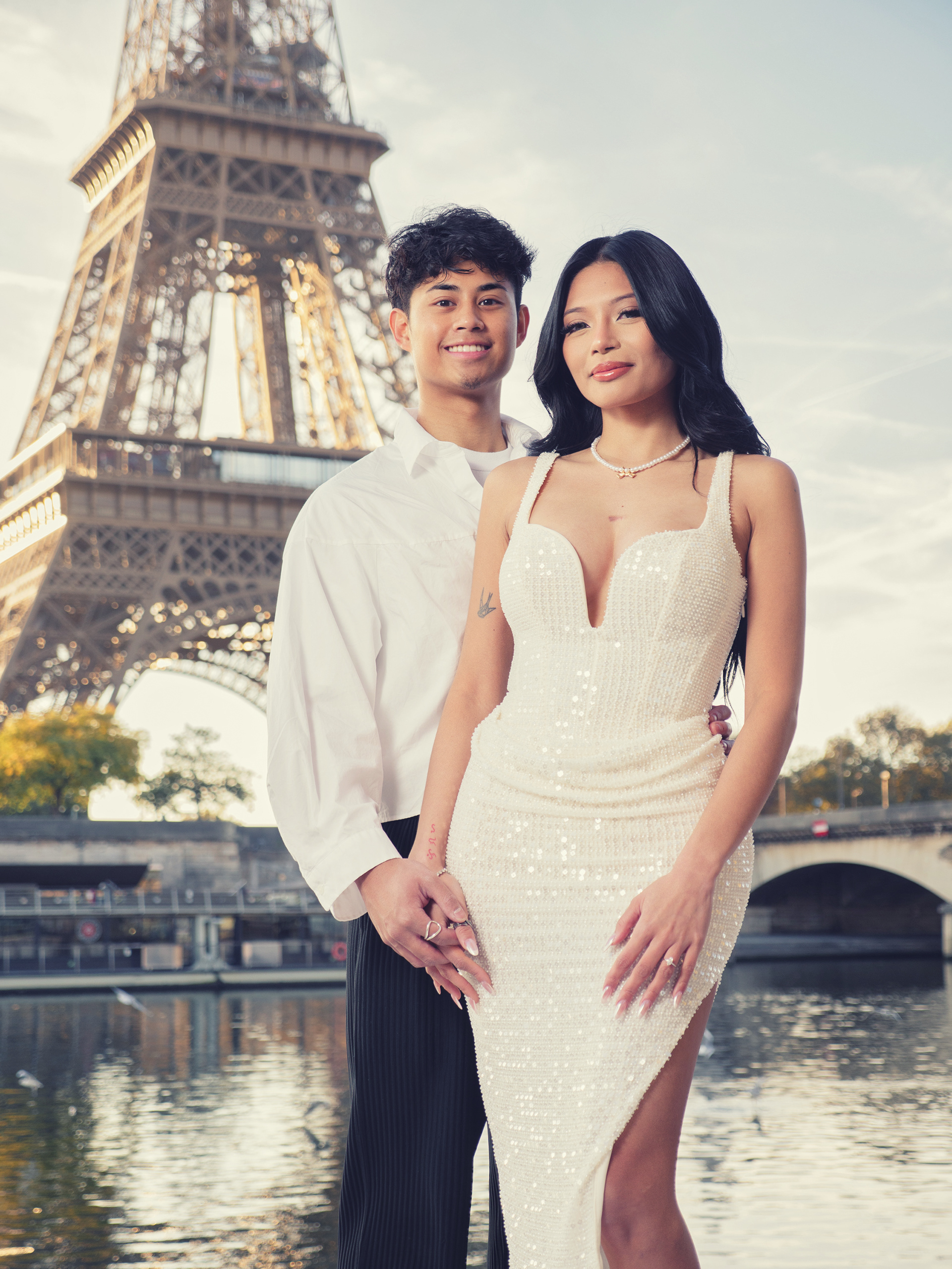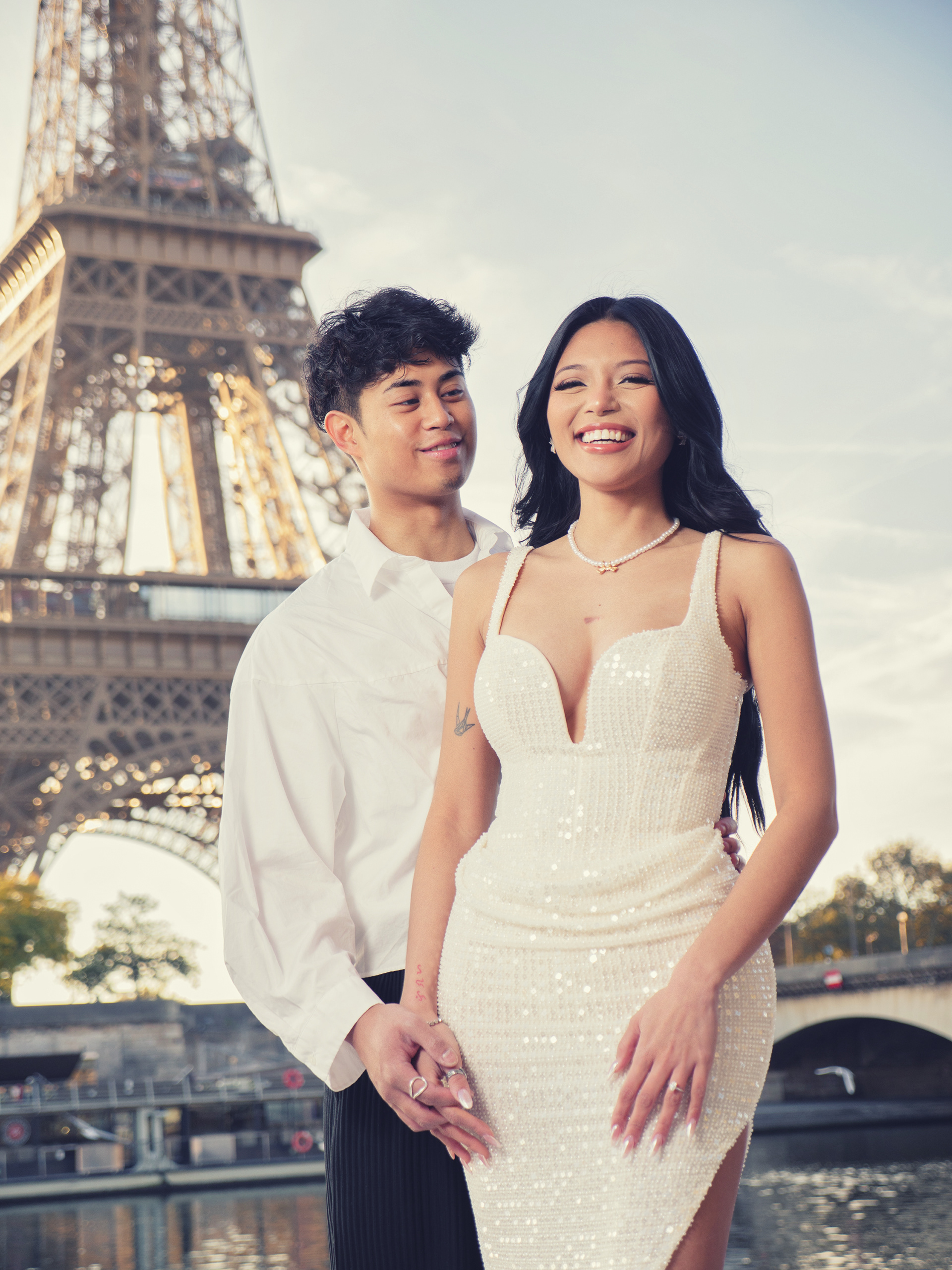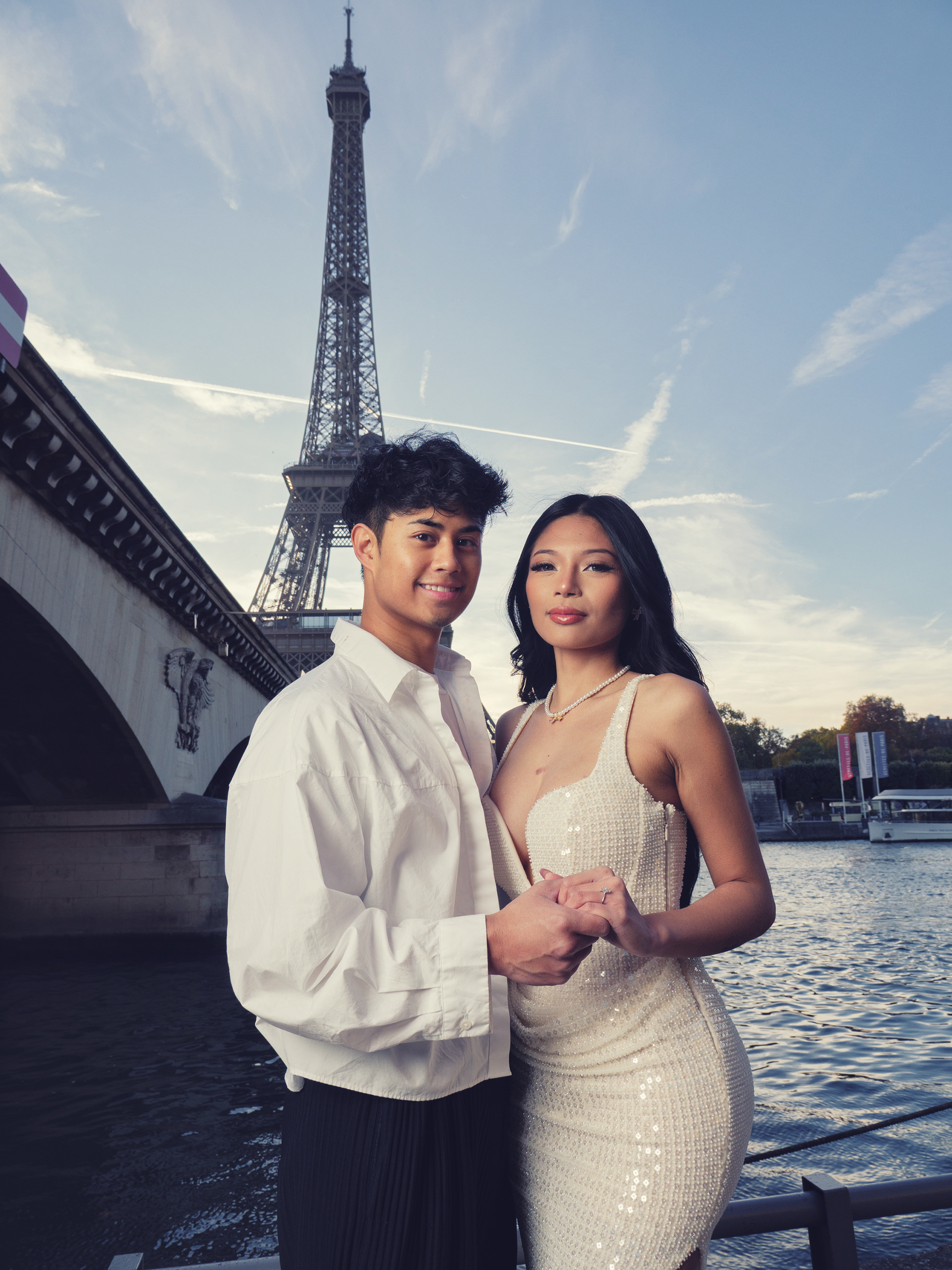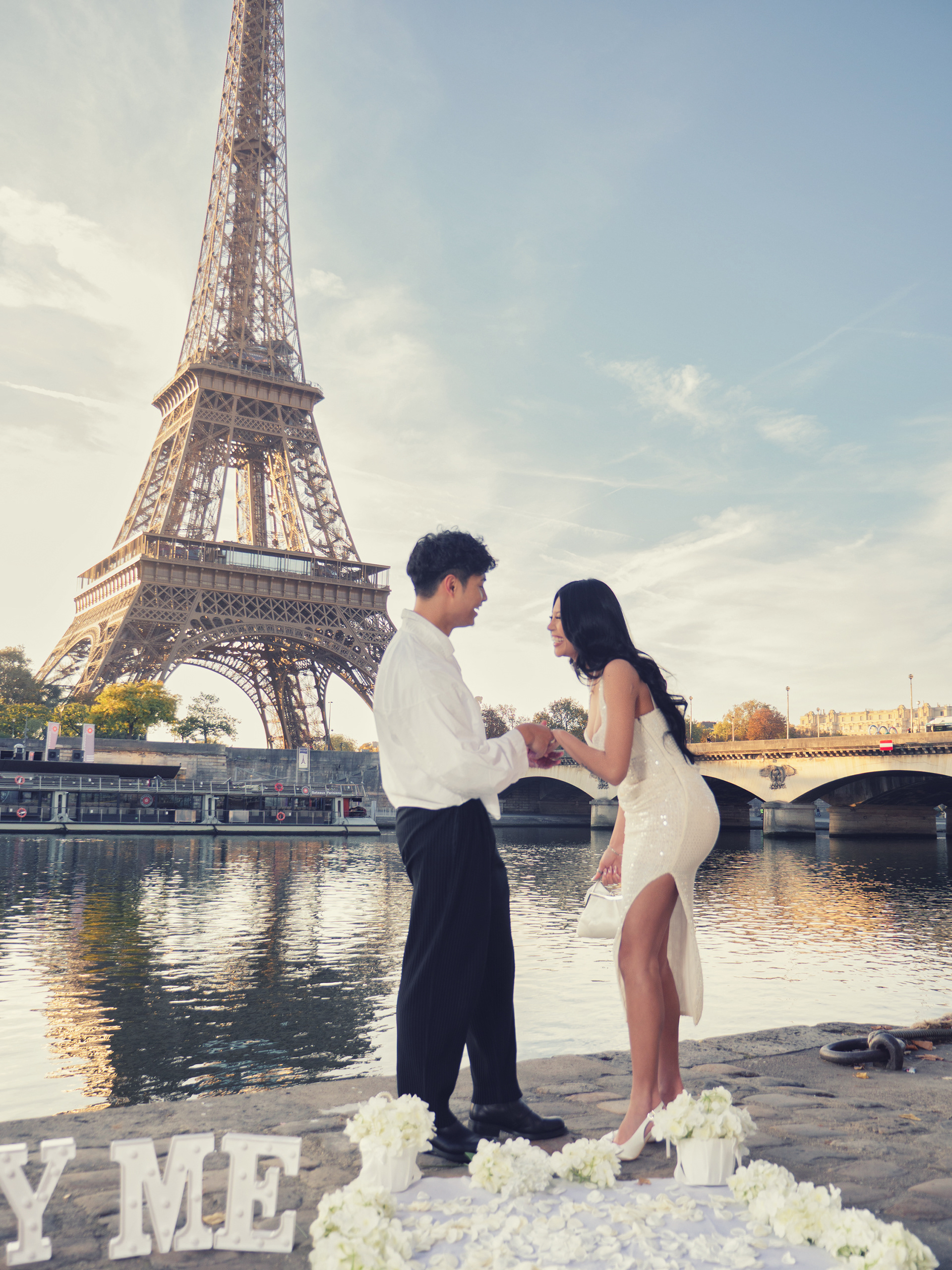 As the day breaks, our couple starts their walk at Place du Trocadero and slowly make their way down to the left bank of the river Seine. Here a white carpet lined with flowers leads the way to the spot where he will get down on one knee and pose the most important question of his life. Basking in the first light of the day, standing across from each other, she accepts as he takes her right hand and put that ring who's traveled halfway around the world on her finger.